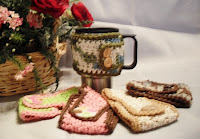 They are crocheted using 100 percent cotton yarn...washable...absorbant... they'll help keep your hot drinks hot and your hands cool and your hands warm and dry with cold drinks...they fit several size takeout cups. I'll be listing them in my Etsy store soon but I'm giving my readers a chance to win one first.